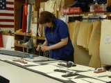 After the order is entered into our production schedule, it is taken to the pattern layout and cutting department. At right, we are checking all the details and then spread the correct fabric and place the pattern pieces. Kay does most of the layout and cutting of our garments. |
